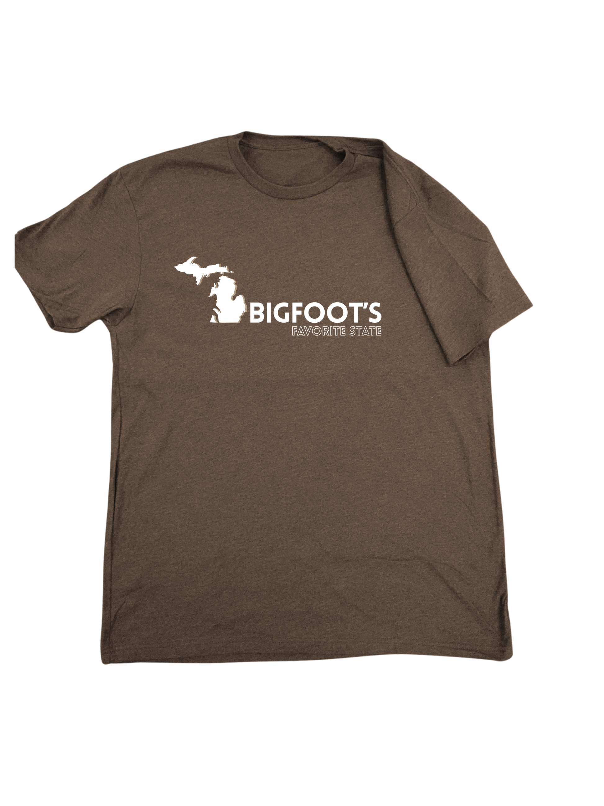 Even Bigfoot knows where the best state is. This tee features "Bigfoot's Favorite State" on the front with a clever Bigfoot silhouette shaped like the mitten—because legends know quality when they see it.