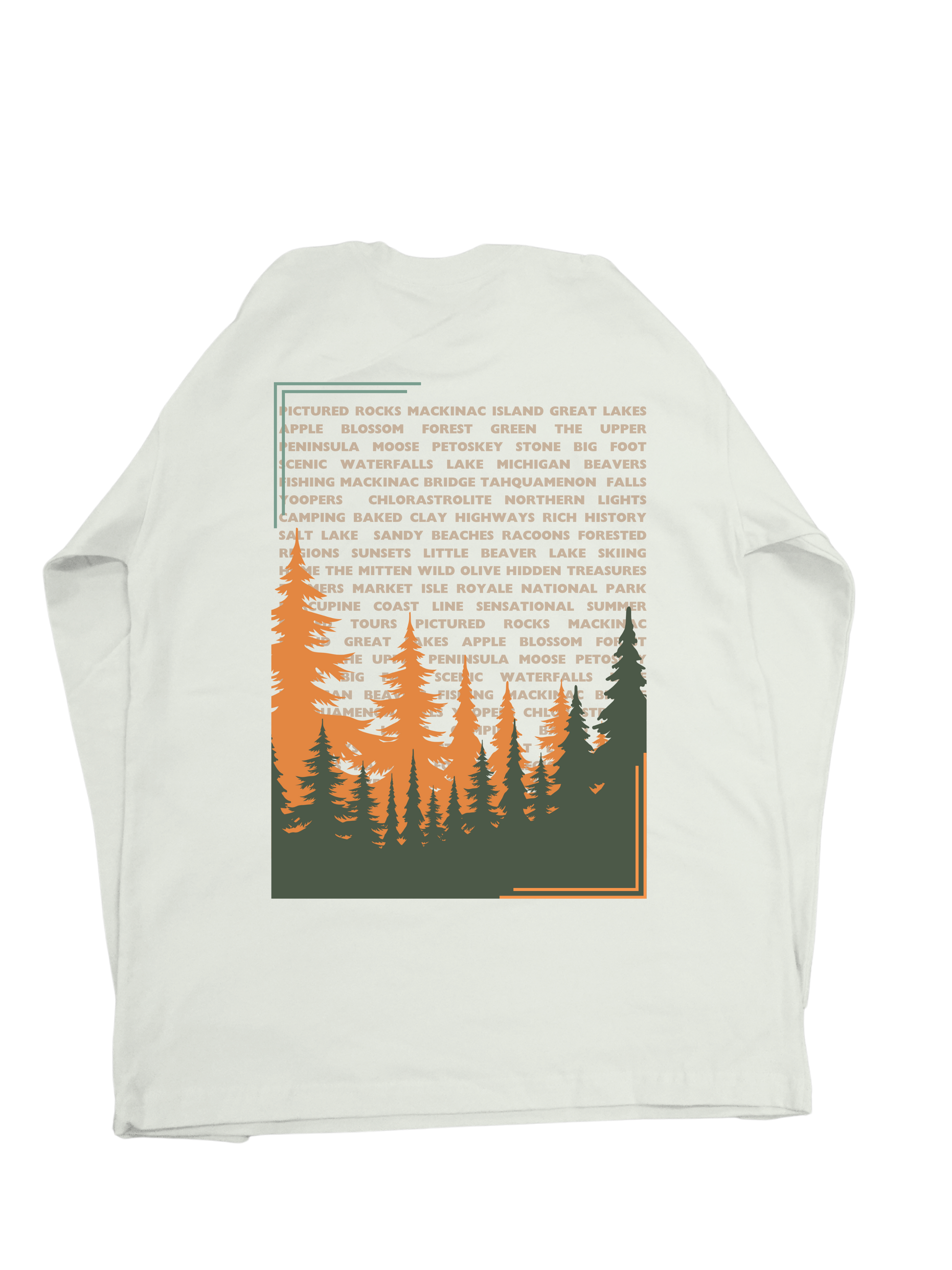 This isn't just a long sleeve—it's a love letter to the Upper Peninsula. Each word on the back represents the places, people, and experiences that make the U.P. unforgettable. The tree line ties it all together, reminding you of those endless forests that make Michigan home.
